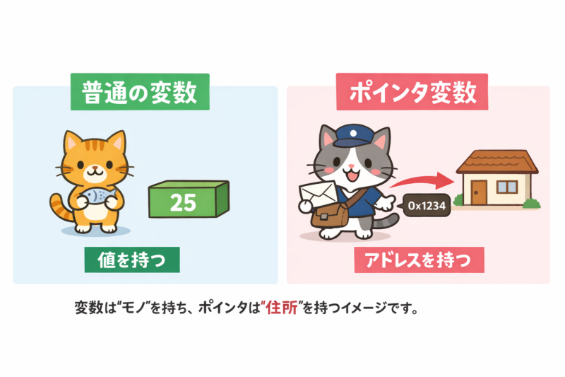上図のように、通常の変数は「値」を保持しますが、 ポインタ変数は「その値が保存されているメモリ上の住所(アドレス)」を保持します。
